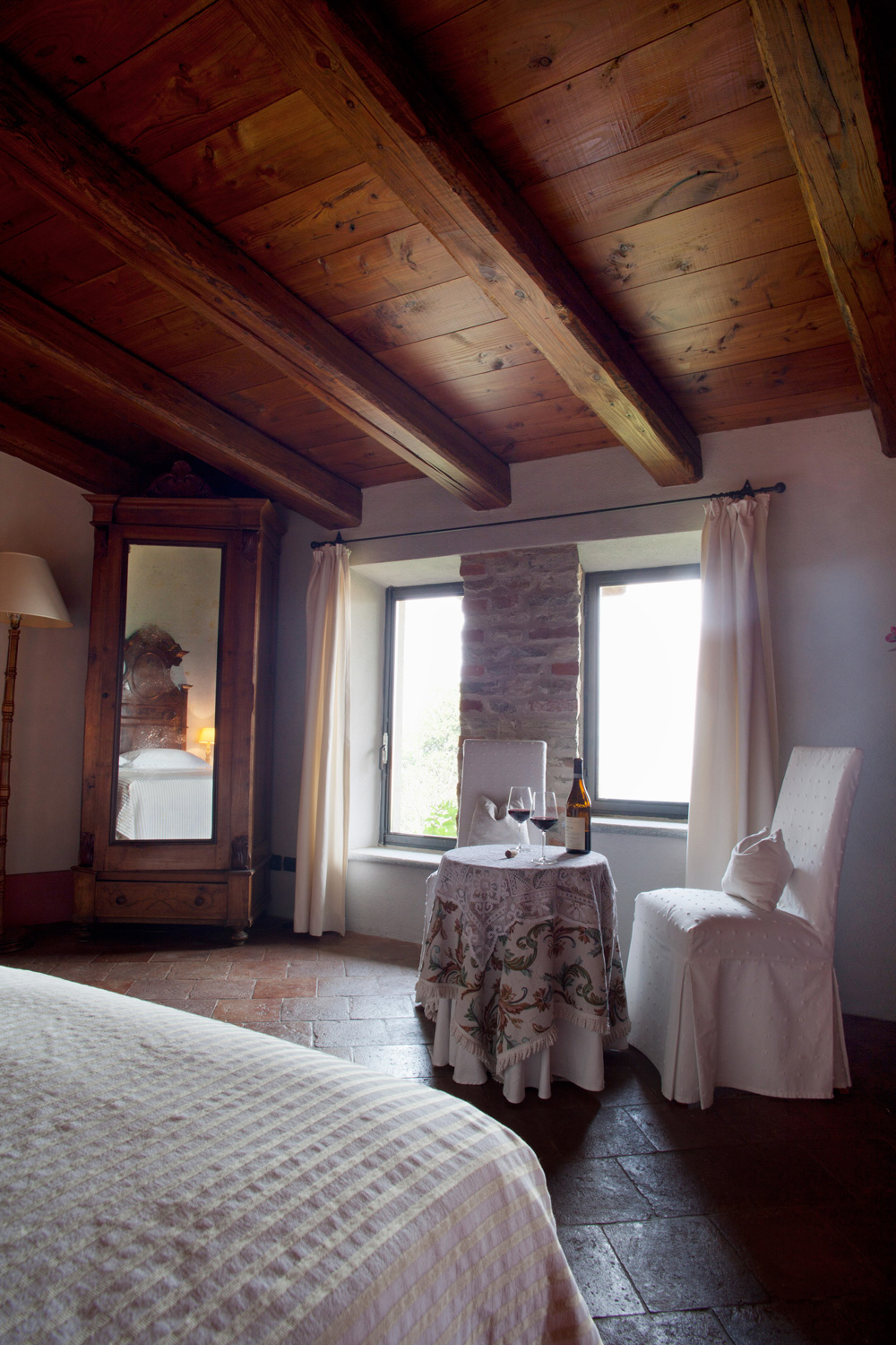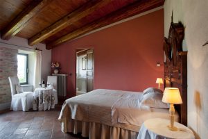 Ampia camera che si distingue per i suoi toni caldi e vigorosi con una vista mozzafiato sulle colline che si può ammirare sdraiati sul letto sorseggiando un bicchiere di vino.