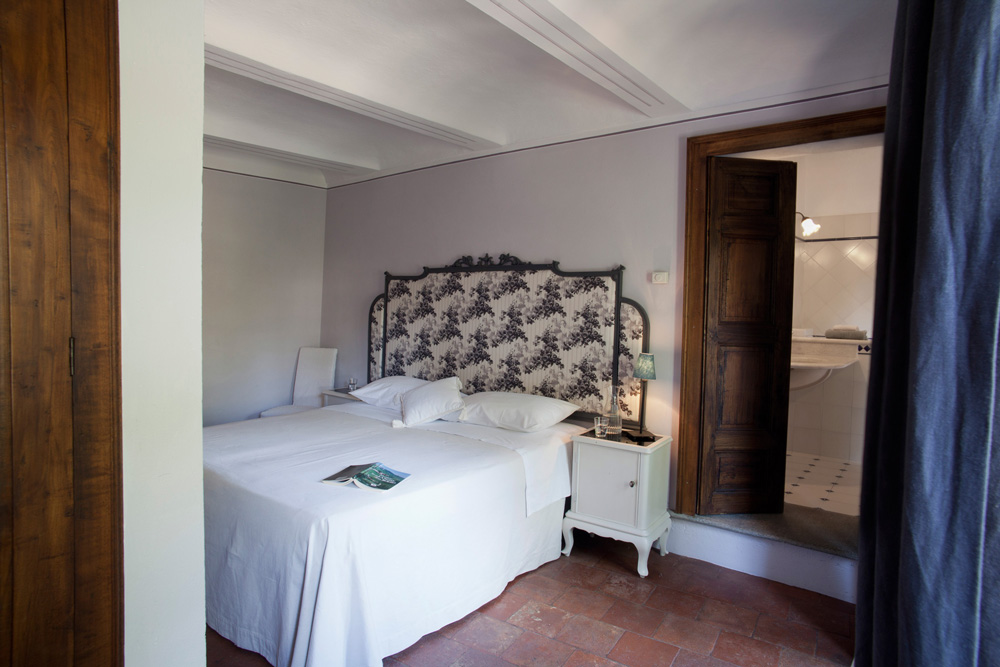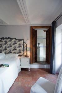 Una camera accogliente e luminosa che si affaccia sul cortiletto interno della Dindina, arredata con gusto particolare e ricercato che si distingue nei piccoli dettagli come i tessuti che richiamano i profumi del vino.