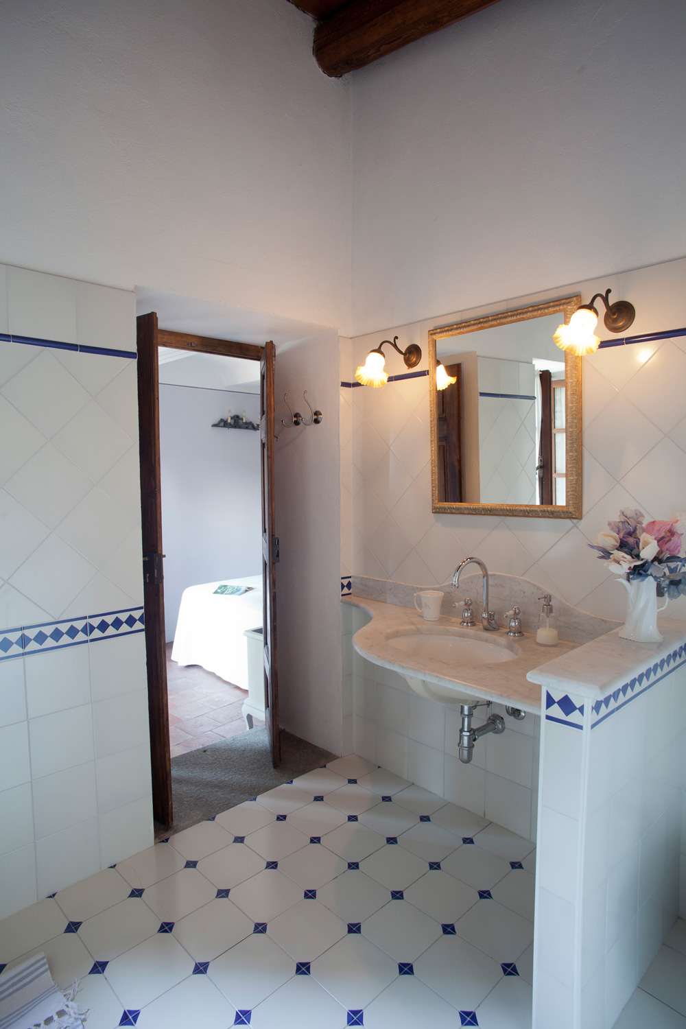 Un grande bagno sui toni rilassanti del blu e un piccolo balcone dove godersi la pace che emana il paese; il posto ideale dove rilassarsi e rigenerarsi.